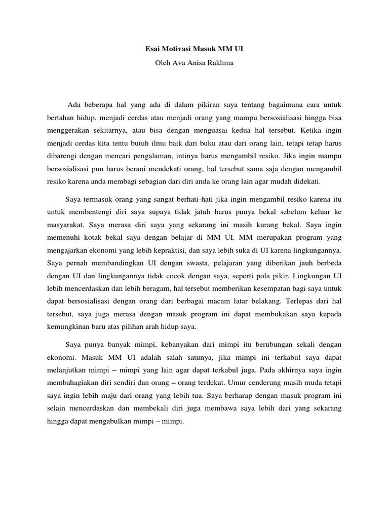 Sesuatu yang sangat mendorong sayamemotivasi sayamembuat saya selalui bangkit dari. Essay motivasi mengikuti program mm-ui By Rina Muasaroh on July 18 2012 Sekitar pukul 2010 hari Senin 16 Juli 2012 saya mendapat SMS dari 628159222 Call Center Program MM-UI yang isinya tentang pemberitahuan kalo hari Rabu tanggal 18 Juli harus mempersiapkan beberapa berkas diantaranya. Tapi untuk pribadi selalu ada yang kurang karena pencapaian didalam hidup itu harus ada dorongan motivasi dari pihak luar.