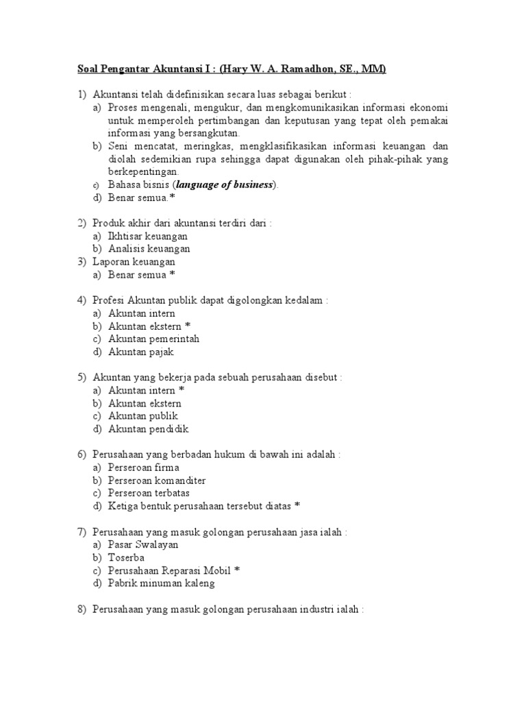 View Soal_Pengantar_Akuntansidoc from AKUNTANSI 11 at Muhammadiyah University of Jakarta. Semester 1 ESPA4122 Matematika Ekonomi EKMA4115 Pengantar Akuntansi MKDU4221 Pendidikan Agama Islam MKDU4222 Pendidikan Agama Kristen MKDU4223 Pendidikan Agama Katolik MKDU4224 Pendidikan Agama Hindu MKDU4225 Pendidikan Agama Budha MKDU4226 Pendidikan Agama Khonghucu EKMA4111 Pengantar Bisnis MKDU4110 Bahasa Indonesia MKDU4111. Soal Pengantar Akuntansi I 1 Akuntansi telah didefinisikan secara luas sebagai berikut.