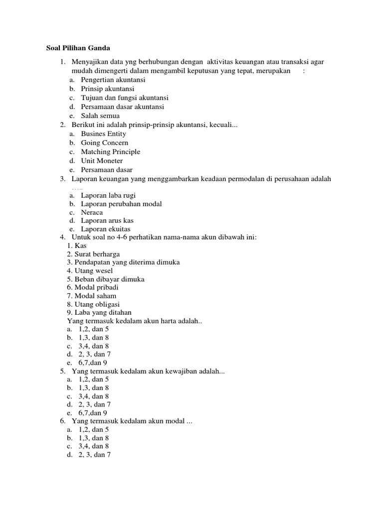 View Soal_Pengantar_Akuntansidoc from AKUNTANSI 11 at Muhammadiyah University of Jakarta. Semester 1 ESPA4122 Matematika Ekonomi EKMA4115 Pengantar Akuntansi MKDU4221 Pendidikan Agama Islam MKDU4222 Pendidikan Agama Kristen MKDU4223 Pendidikan Agama Katolik MKDU4224 Pendidikan Agama Hindu MKDU4225 Pendidikan Agama Budha MKDU4226 Pendidikan Agama Khonghucu EKMA4111 Pengantar Bisnis MKDU4110 Bahasa Indonesia MKDU4111. Soal Pengantar Akuntansi I 1 Akuntansi telah didefinisikan secara luas sebagai berikut.