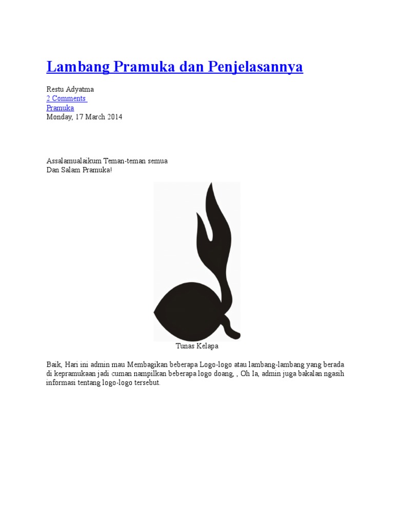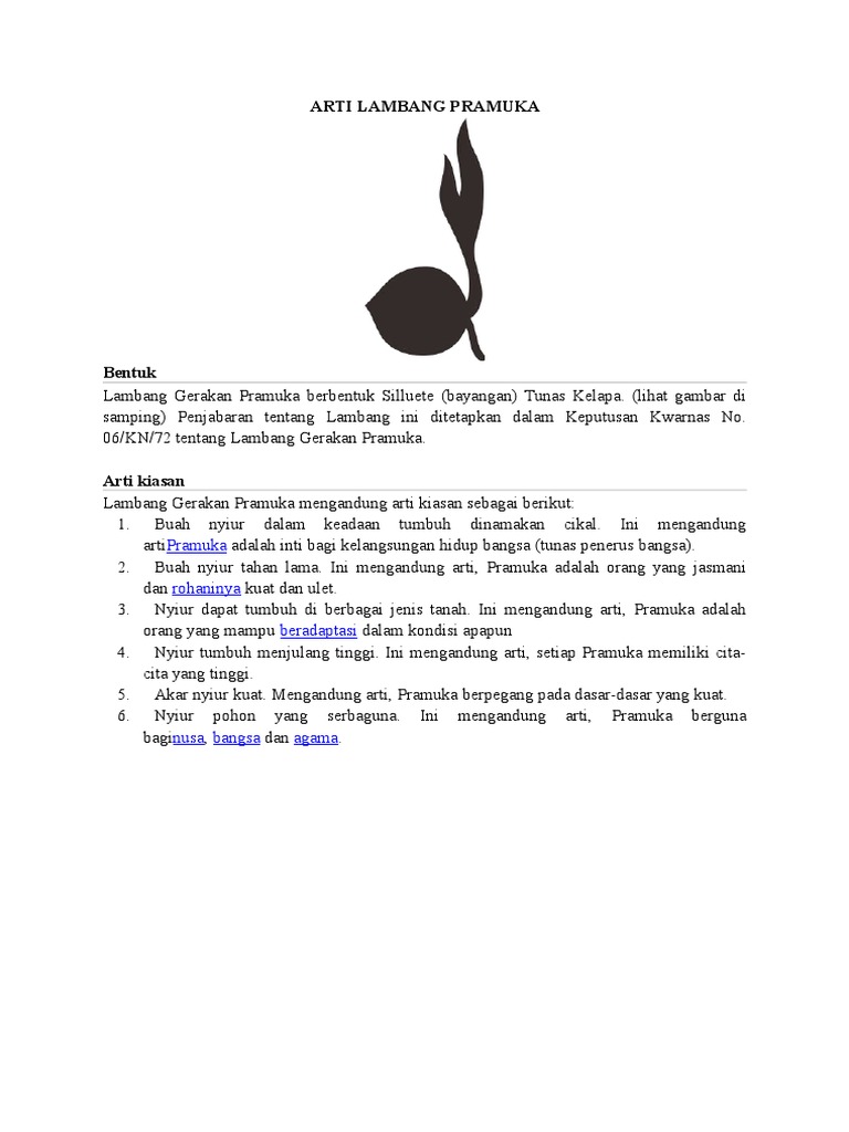 Di Indonesia gerakan Pramuka dilambangkan dengan tunas kelapa. Gambar lambang pramuka atau logo pramuka diatas biasanya digunakan sebagai tada pelantikan pada jenjang pendidikan di Pramuka baik penegakpenggalang pandega atau tingkatan pramuka yang lainnya. Lambang lambang Kata Nomina kata benda 1 sesuatu seperti tanda lukisan lencana dan sebagainya yang menyatakan suatu hal atau mengandung maksud tertentu.