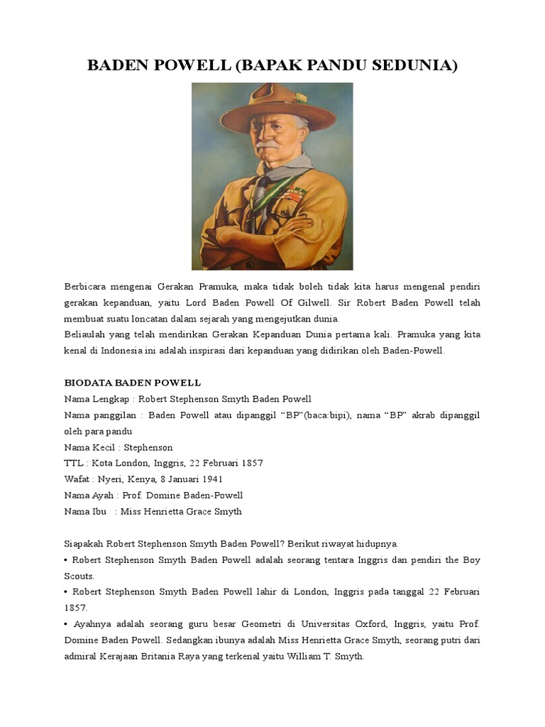 Biografi baden powell lengkap. Pramuka yang kita kenal di Indonesia. Bergabung dengan Pasukan Hussars Ke-13 di India pada tahun 1876. Sir Robert Baden Powell telah membuat suatu loncatan dalam sejarah yang mengejutkan dunia.